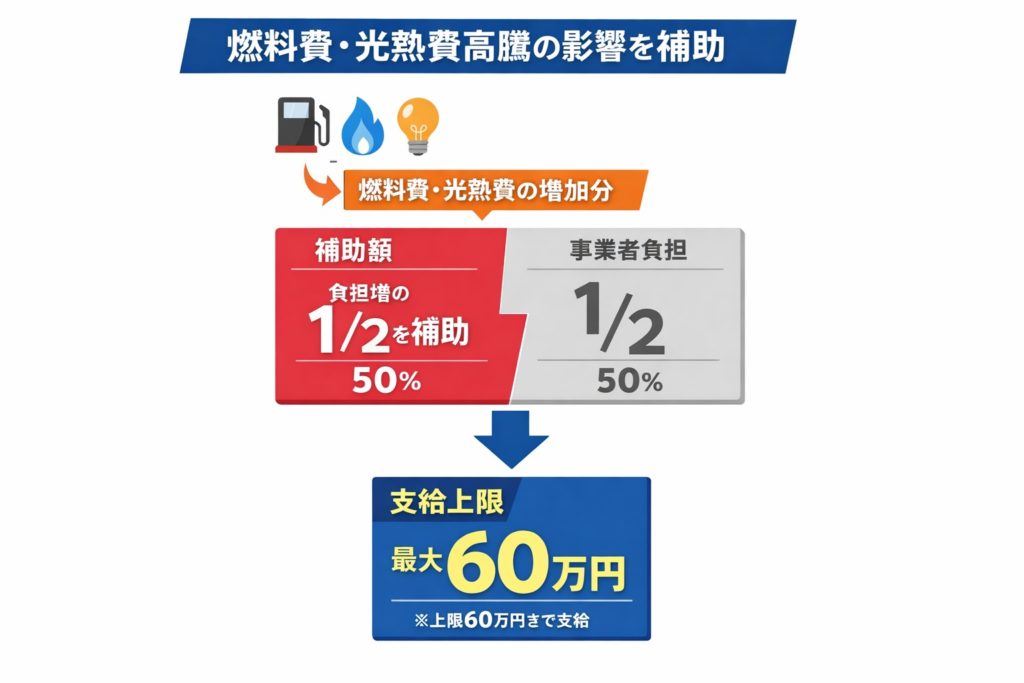 本制度では、電気・ガス・燃料費等の価格上昇分の一部が補助され、最大60万円の支給が受けられます。